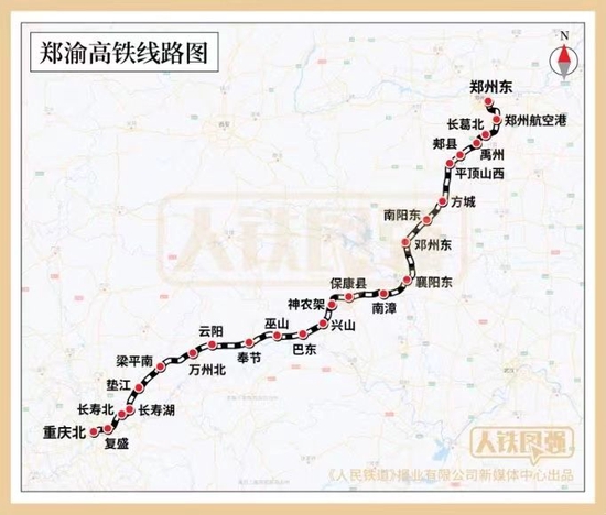 6月20日开通的襄阳东至万州北段全长434公里,按上限标准时速350公里设计,常态化按时速310公里达标运营,途经湖北省襄阳市、荆门市、宜昌市、恩施土家族苗族自治州和重庆市巫山县、奉节县、云阳县、万州区,设襄阳东、南漳、保康县、神农架、兴山、巴东、巫山、奉节、云阳、万州北10座车站。全线贯通后,郑渝高铁将串联起嵩山少林寺、襄阳古隆中、神农架原始森林、奉节白帝城、巫山大小三峡等众多著名旅游景点,形成连接中原、华中和西南地区的快捷高速铁路通道。