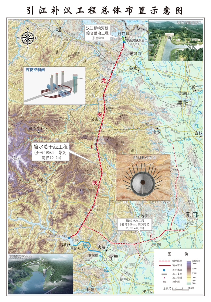 引江补汉工程是从长江引水至汉江的大型输水工程,工程全长195公里,工程静态总投资582.35亿元。该工程由水利部负责,长江水利委员会负责项目规划设计总成。受地形条件限制,全程采用隧洞输水,隧洞开挖断面13米,地质条件极其复杂,在一切情况顺利下预计总工期约9年。 引江补汉工程是南水北调后续工程,根据《引江补汉工程规划》,引江补汉工程多年平均从长江引水38.7亿m³,扣除输水损失后净补水36. 7亿m³。